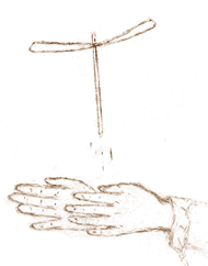 Zet het helikopertje (rechtop!) tussen de handen, en geef het een stevige draai door de handen langs elkaar te wrijven, zoals hierboven.